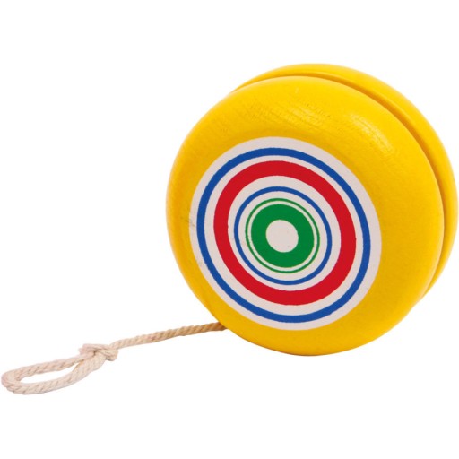 JOJO jest wykonane z drewna i ładnie pomalowane i polakierowane bezpiecznymi farbami. Ma żółty kolor i okręgi w kolorach: zielonym, niebieskim, białym i czerwonym. Ma także naturalny biały sznureczek.