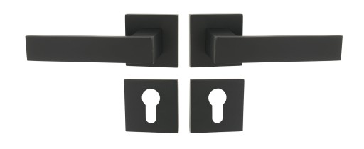 Komplet klamek z rozetami kwadratowymi pod klucz, pod wkładkę patentową lub pokrętłem łazienkowym
