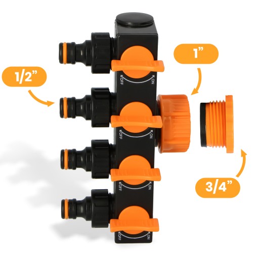 Rozdzielacz został wyposażony w 4 wyjścia na szybkozłączki umożliwiające błyskawiczne podłączenie węży. Ma również 4 niezależne zawory do regulacji, dzięki czemu istnieje możliwość zamknięcia tylko jednej linii nawadniającej.