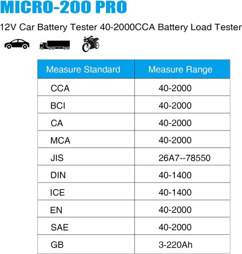 do testowania baterii 12 woltów. (car. motorcycle) oraz do testowania systemów ładowania 12 i 24 woltów (car.motorcycle.truck), wskazówki: ciężarówka może tylko przetestować system 24v. nie baterii 24 v.