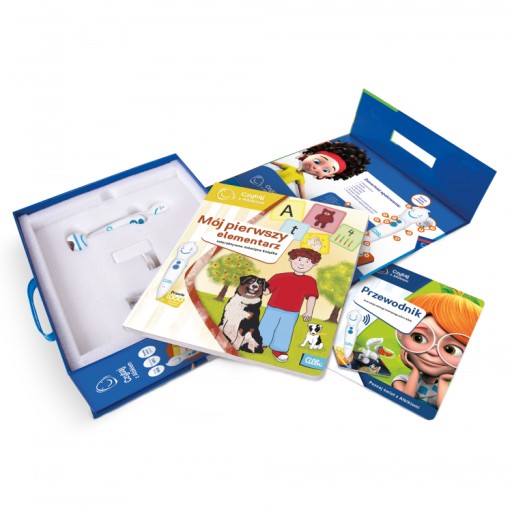 Książka "Mój pierwszy elementarz" dla młodszych dzieci, z której uczą się rozpoznawać cyfry, litery, kolory i kształty w przyjemny sposób. Książkę urozmaicają zabawne odgłosy, dialogi i piosenki.