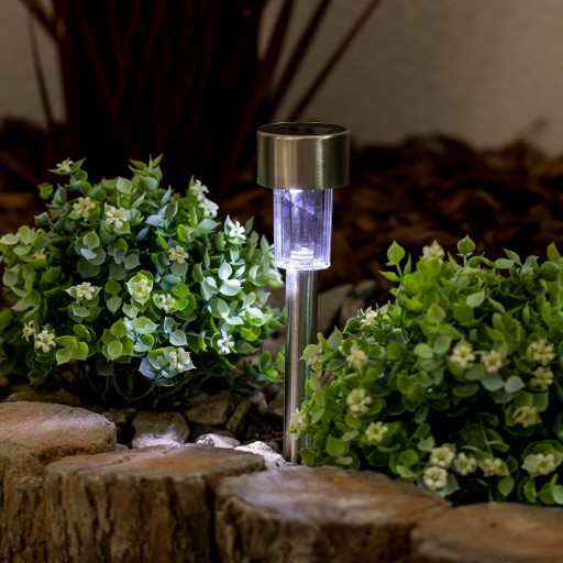 Komplet 10 lamp solarnych wodoszczelnych (IP44) w eleganckim kolorze inox stanowi doskonałe dekoracyjne, jak i praktyczne oświetlenie dla Twojego ogrodu. Doskonale podkreśli atmosferę otoczenia domu, dodając niepowtarzalny klimat poprzez niezwykłą grę świateł i cieni, a przede wszystkim, dzięki nietypowej budowie.
