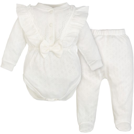 Zestaw body i półśpiochów został wykonanych z lekkiej dzianiny o efektownej dziurkowanej strukturze. Fantastycznie sprawdzi się wiosną i latem. Komplet posłuży jako piękny ale jednocześnie wygodny ubiór dla dziewczynek na specjalne okazje, również Chrzest.