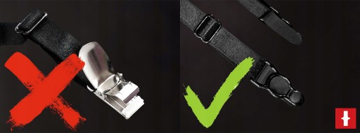 - Metalowe regulatory – tylko one są w stanie utrzymać wybrany rozmiar ! W odróżnieniu od plastiku, nie zmieniają swojego kształtu i zapobiegają przesuwaniu się szelek nawet przy dużym naprężeniu.