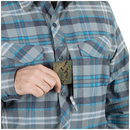 Koszula w klasyczną kratę zapina się mocnymi guzikami z subtelnie wybitym napisem Helikon-Tex®. Na listwie guzikowej została wszyta niewielka szlufka, na której można wygodnie zawiesić okulary.