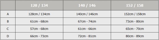 A - wzrost, B - obwód klatki, C - obwód talii, D - obwód bioder