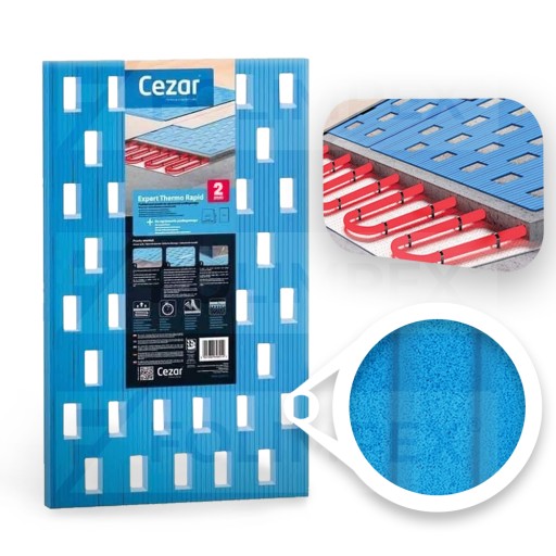 Podkład podłogowy Expert Thermo Rapid CEZAR wykonany jest z polistyrenu ekstrudowanego XPS przeznaczonego pod wszystkie typy podłóg pływających, w których zastosowano ogrzewanie, bądź chłodzenie podłogowe. Izolacja podłogowa występuje w postaci prostokątnej płyty. Jej ergonomiczny kształt pozwala na szybki system montażu oraz prostą obróbkę. W płycie występują prostokątne otwory umożliwiające idealne rozprowadzenie ciepłego lub zimnego powietrza z systemu podłogowego na całej powierzchni posadzki podłogowej. Izolacja podłogowa występuje wyłącznie w jednej grubości. Podkład podłogowy jest jedynym produktem takiego typu na rynku europejskim, co nadaje mu miano innowacyjnej izolacji podłogowej.