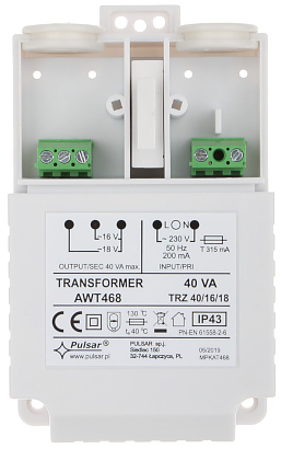 Napięcie zasilania: 230 V AC ; Napięcie wyjściowe: 16 V AC, 18 V AC ; Wydajność prądowa zasilacza: 2.2 A @ 16 V AC, 2 A @ 18 V AC ;