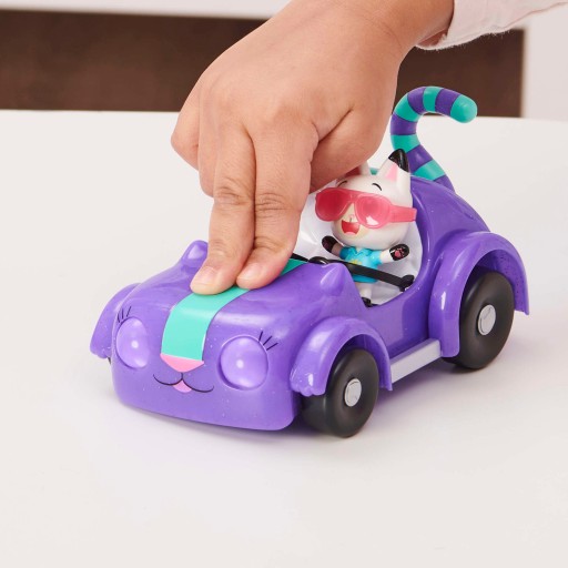 Fioletowe autko Carlita jest przyozdobione czerwonym brokatem. Przez jego środek przechodzi turkusowy pasek. Samochód posiada z tyłu ruchomy ogon w paski, a w miejscu przednich świateł są oczy, które zamykają się po naciśnięciu maski auta. W zestawie jest też figurka kotka Pandy Paws (ok. 6 cm).