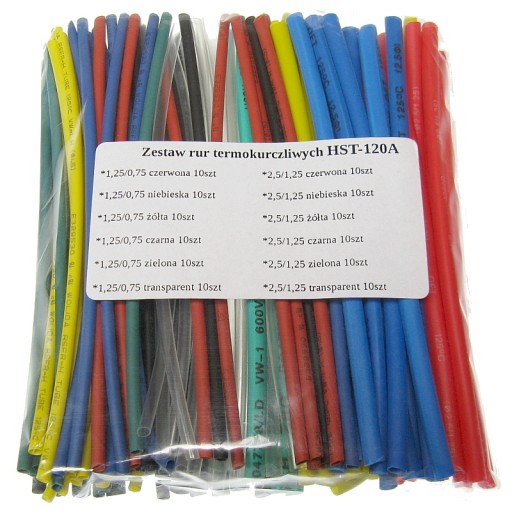 Zestaw wysokiej jakości rurek termokurczliwych. W skład zestawu wchodzi 120 sztuk rurek termokurczliwych o długości 10cm każda. Koszulki chronią przewody przed wilgocią i korozją.