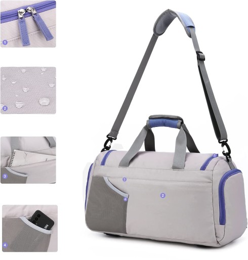 Praktyczna damska torba sportowa: posiada pojemną komorę główną o pojemności 40 L, wymiary 53 x 27 x 27 cm, waga: 1,05 kg. Rozmiar damskiej torby sportowej może spełnić wymagania bagażu lotniczego. Torba treningowa, torba fitness do podróży i codziennego użytku.