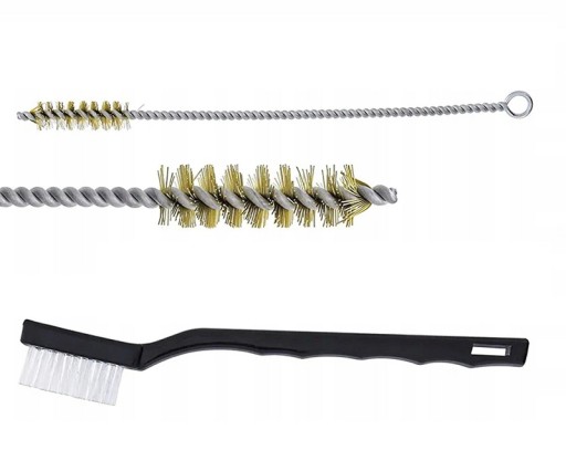 W skład zestawu wchodzi 21 części różnych wyciorów, szczotek, pędzelków i oliwka.