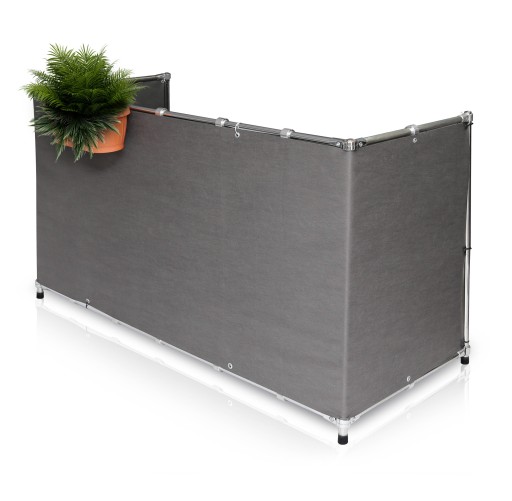 Osłona wykonana jest z materiału odpornego na warunki atmosferyczne: deszcz, mróz, promienie słoneczne UV, nie rozciąga się. Posiada oczka metalowe mocowane co 50 cm na górze, dole i brzegach materiału. Tkanina barwiona jest w masie dlatego nigdy nie wypłowieje od słońca, zawsze utrzyma ten sam kolor. Bardzo ładnie układa się na balustradzie nie marszczy się i nie wichruję.