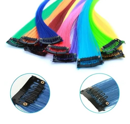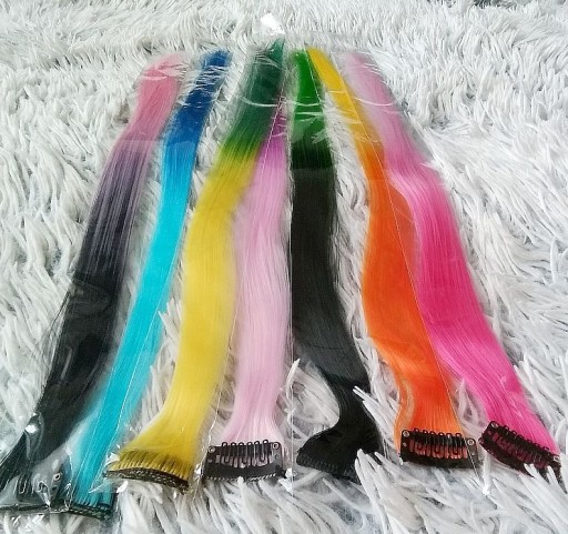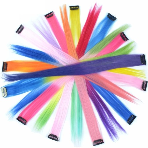 Kolorowe proste pasemka wykonane z wysokiej jakości włókna syntetycznego kanekalonu ,wyposażone są w małe klipsy do zamocowania , łatwe i proste w użyciu , możesz je dowolnie modelować /do 150C/ i skracać nożyczkami wg uznania