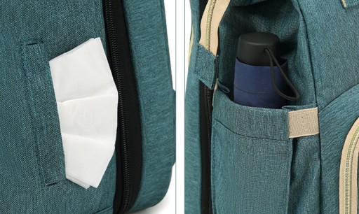 - Posiada kieszeń na telefon, kieszenie na butelki oraz słoiczki, a także na chusteczki jednorazowe.