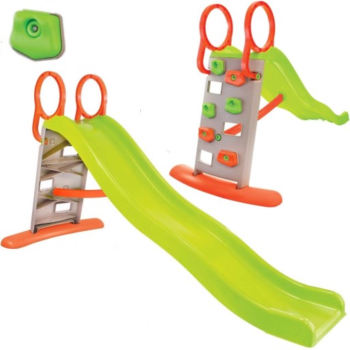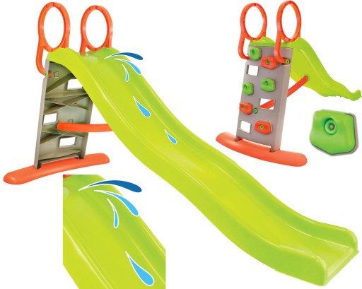 Zjeżdżalnia z ergonomicznymi uchwytami, ścianką wspinaczkową, stabilna konstrukcja plastikowa, możliwość podłączenia węża ogrodowego do zraszania ślizgu, możliwość demontażu.