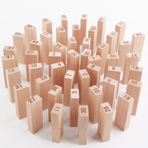 - Zawartość opakowania: 54 drewniane klocki o wymiarach 7,5 x 2,5 x 1,5 cm każdy