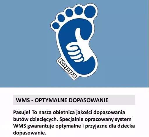 WMS to znak jakości od KAPPA zapewniający dobre dopasowanie rozmiaru do stopy dziecka poprzez wieloletnie badania długości tęgości stóp dzieciaczków w danych przedziale wiekowym, który ułatwia rodzicom w doborze odpowiedniego rozmiaru bucików oraz prawidłowego rozwoju stopy. Rodzice od ponad pięćdziesięciu lat polegają na jakości i kondycji WMS. Norma ta jest osiągnięta poprzez przestrzeganie ścisłych wytycznych, co gwarantują badania niezależnego organu - niemieckiego instytutu obuwia. Tylko buty spełniające te wytyczne otrzymają znak WMS.