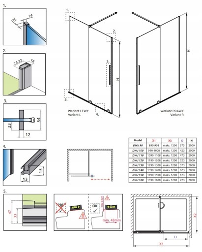 Drzwi Furo DWJ można zamontować zarówno na posadzce jak i na brodziku. W przypadku montażu na brodziku – szerokość rantu brodzika musi wynosić minimum 43 mm, a jego pochylenie max. 1 mm.