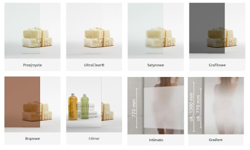 - Szkło bezpieczne, hartowane o grubości 8 mm