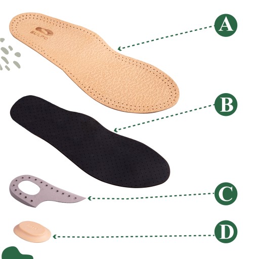 D - Amortyzator pięty - Wykonany z lateksu, amortyzuje nacisk ciała na piętę. Pomaga w równomiernym rozłożeniu obciążeń działających na pięty. Zmniejsza uczucie bólu pięt.