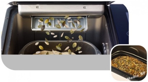 - Automatyczny dozownik do ziół, orzechów, nasion, suszonych pomidorów, oliwek itp. Dzięki temu pozostają one w całości, jeżeli zostaną dodane na samym początku razem z pozostałymi składnikami, wówczas zostaną zbyt rozdrobnione i nie będą widoczne w upieczonym chlebie.