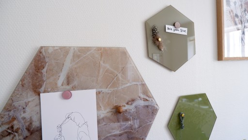 Szklana tablica magnetyczna suchościeralna heksagonalna - marmur beżowy 42x48 cm duńskiej firmy NAGA