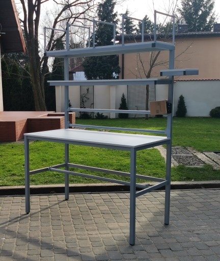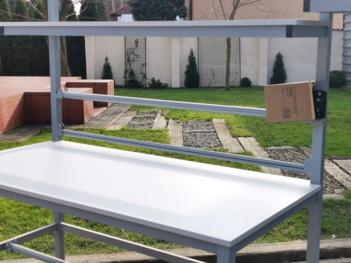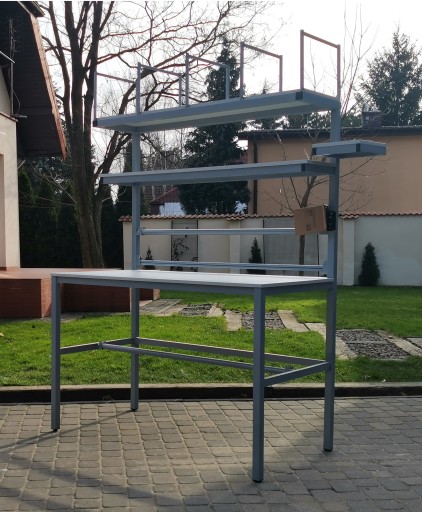 Wysokiej jakości stół warsztatowy do pakowania paczek wykonany z profili metalowych spawanych w stabilną bryłę.