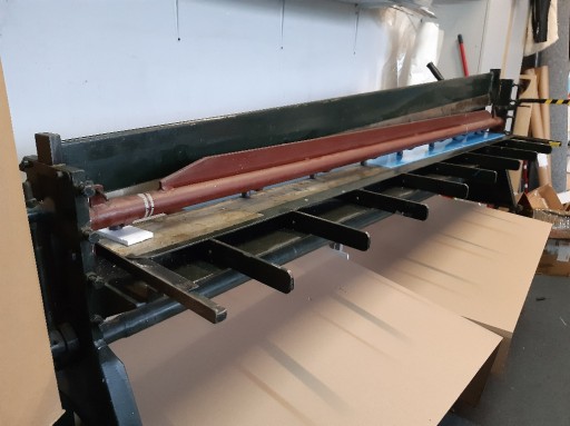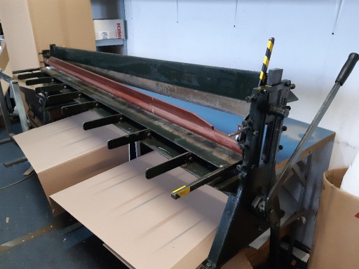 Gilotyna tnie systemem nożycowym. Stopniowe odcinanie pasa blachy gwarantuje równe i dokładne cięcie, bez uszkodzeń i zniekształceń krawędzi blachy. Nożyce nie szczerbią i nie powodują fałdowania brzegów. Doskonale nadają się do cięcia blach powlekanych, laminatów, płyt z tworzyw sztucznych itp.. Nóż tnący, dla zwiększenia wytrzymałości, podzielony został na segmenty. Nóż posiada po obu stronach krawędź tnącą. Po stępieniu jednej ze stron obraca się go o 180° i tnie ostrzem po drugiej stronie. W zestawie znajduje się stół do podtrzymywania blachy z regulacją powtarzalnych cięć, docisk /gumowy /punktowy przed belką tnącą i zderzak pomiarowy za belką.