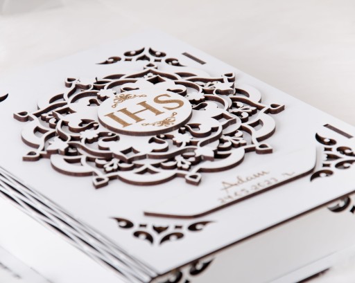 Skrzyneczka w kształcie książki - w środku zawiera wnękę, w której idealnie mieści się Pismo Święte.
