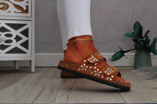 Damskie klapki casual na dwie klamry w kolorze camel. Sprawdzą się idealnie jako obuwie na co dzień. Będą odpowiednie na ciepłe, wiosenne i letnie, upalne dni. Pasują do wielu stylizacji. Płaska, korkowa podeszwa oraz profilowana wkładka zapewniają komfort i wygodę użytkowania.