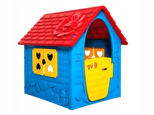 Każda ścianka domku przedstawia motywy różnych zwierzątek : kotka, pieska, czy króliczka, które przyciągają uwagę dziecka. Dom wygląda bardzo realistycznie - ma dach pokryty ''dachówką'' oraz ''elewację z deski''. Domek posiada otwierane okiennice oraz drzwi wejściowe, na których znajduje się skrzynka na listy (otwór w drzwiach) oraz miejsce na klucz. Dziecko może poczuć się jak w prawdziwym domu! Natomiast z tyłu znajduję się okiennica z kratką, a poniżej dodatkowe wyjście z domu- dzieci uwielbiają ten rodzaj zabawy.