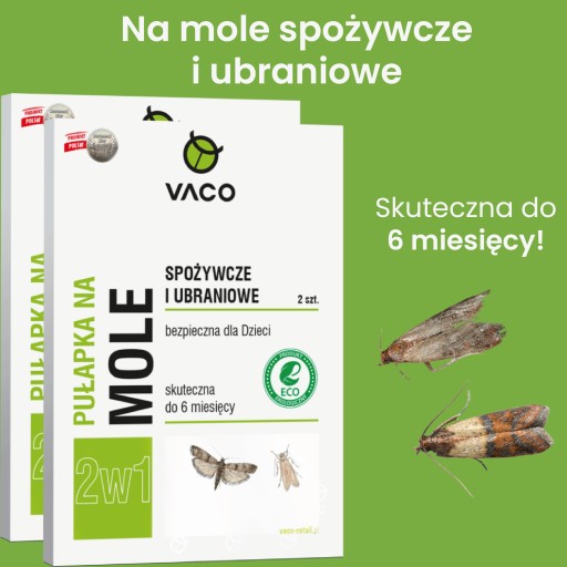 Ze względu na przyjazny skład pułapka na mole VACO jest bezpieczna dla dzieci i zwierząt domowych, może być stosowana w pobliżu żywności.