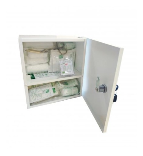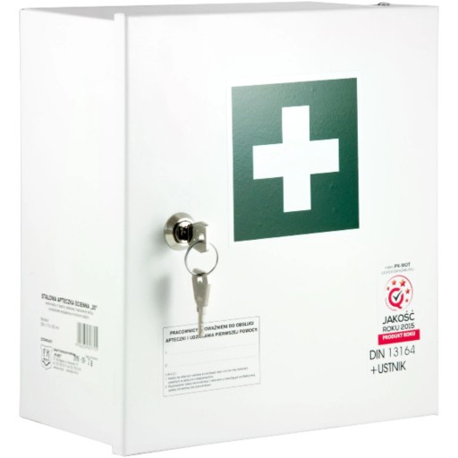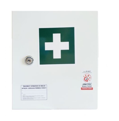 Apteczka pierwszej pomocy, ścienna Wymiary: 24 cm x 26 cm x 13 cm Kolor: Biały Marka: PK-MOT wykonana z blachy stalowej malowanej farbą proszkową wypalaną w kolorze białym wyposażenie zgodne z normą DIN 13164 14-częściowy zestaw plastrów z opatrunkiem: 6x10 cm (4 szt.), 4,3x7,2 cm (2 szt.), 12x2 cm (2 szt.), 1,9x7,2 cm (2 szt.), 2,5x7,2 cm (4 szt.) plaster na szpulce 5 m x 2,5 cm (1 szt.) bandaż elastyczny 4 m x 6 cm (2 szt.) bandaż elastyczny 4 m x 8 cm (3 szt.) rękawiczki winylowe (2 pary) chusteczki nasączone (2 szt.) chusta opatrunkowa 60x80 cm (1 szt.) chusta opatrunkowa 60x40 cm (1 szt.) bandaż z kompresem (opatrunek indywidualny) 6x8 cm (1 szt.) bandaż z kompresem (opatrunek indywidualny) 8x10 cm (2 szt.) bandaż z kompresem (opatrunek indywidualny) 10x12 cm (1 szt.) kompres na rany 10x10 cm (6 szt.) chusta trójkątna 96x96x136 cm (2 szt.) koc termiczny 160x210 cm (1szt.) nożyczki (1szt.) ustnik do sztucznego oddychania instrukcja udzielania pierwszej pomocy przeznaczona do zakładów pracy wymiary apteczki:13x26x24 Normy: DIN 13164 Produkt polecany dla branż: - Obsługa techniczna obiektów w tym hoteli, prace domowe oraz porządkowe, kwiaciarnie - Przemysł spożywczy w tym obsługa restauracji oraz służby zdrowia i lecznictwa - Usługi ochrony w tym ratownicy i strażacy oraz obrona narodowa