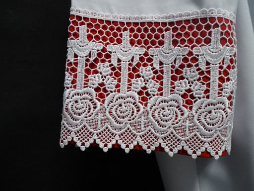 Alba wykonana z białego materiału zdobiona gipiurą o szerokości 20 cm z czerwoną podbitką. Na innej mojej aukcji alba dostępna również z czarną i amarantową podbitką oraz w wersji bez podbitki.