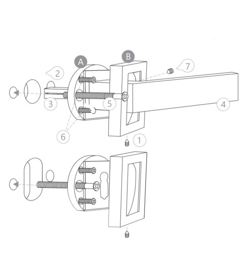 - Należy odkręcić śrubę imbusową i oddzielić zewnętrzną osłonkę (B) od korpusu klamki (A).