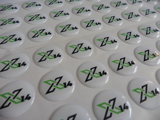 Druk 4+0 CMYK Wydruk jest wycinany za pomocą plotera w pożądanym kształcie. Następnie powlekany jest przezroczystą żywicą. Z uwagi na fizyczne właściwości żywicy projekt nie może zawierać ostrych rogów - wszystkie rogi muszą być zaokrąglone (minimalny promień zaokrąglenia każdego rogu to 1mm).