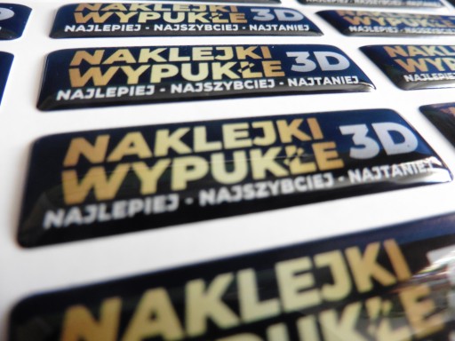 Naklejki wypukłe 3D to doskonały sposób na wyeksponowanie Twojego logo. Kolorowy znak zatopiony w estetycznej powłoce z żywicy poliuretanowej jest nie tylko trwały, ale również świetnie wygląda. Naklejki 3D mogą być stosowane jako efektowne wykończenie breloka, można je nakleić na produkty AGD i RTV, telefony komórkowe, elementy samochodu i w wielu innych miejscach, ograniczeniem jest tylko wyobraźnia. Z uwagi na wysoką trwałość pokrycia, naklejki są odporne na promienie słoneczne, wilgoć, wysoką i niską temperaturę. Produkowane przez nas naklejki są drukowane w technologii eco mild solvent. Naklejki są dostarczane do Państwa w arkuszach, możliwe jest wykonanie perforacji między naklejkami (dodatkowo płatne), aby łatwo było je od siebie oddzielić. Większość naklejek dostarczanych jest na arkuszach 238 x 350 mm, jednak wielkość arkusza może się zmienić i zostać dostosowana do nakładu i formatu zlecenia.