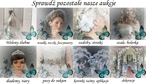 Przedmiotem sprzedaży jest elegancka woalka, toczek, fascynator, ozdoba ślubna na dwóch metalowych spinkach, które dobrze trzymają zdobienie we włosach długich jak również bardzo krótkich, można zamocować w dowolnym miejscu uczesania. Aby tkanina na woalce lepiej się układała można fałdy tkaniny do włosów przypiąć kokówkami lub wsuwkami, wówczas tkaninę można układać według własnego upodobania.
