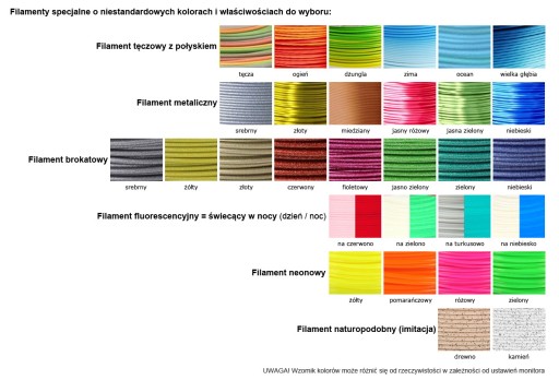 - filament specjalny dostępny w kolorach,według wzornika poniżej