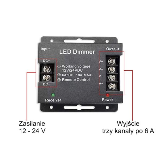 Posiada trzy wyjścia o obciążalności prądowej po 6 A każde, co w sumie może dać możliwość podłączenia led o mocy az 400W