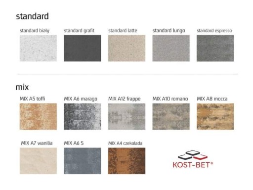 Kolorystyka: Grafit, Biały, Toffi, Marago, Mocca, Wanilia, A6S, Czekolada