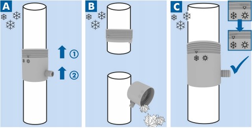Zbieracze uniwersalne, pasują do rur o średnicach w zakresie 80 - 105 mm oraz rur z dowolnego materiału, tj. zarówno plastikowych jak i metalowych. Zbieracze można montować na już istniejącej instalacji bez konieczności zdejmowania rury. Zbieracz posiada wbudowany filtr. Zbieracz posiada nastawę lato / zima przez obrócenie kopułki. Nastawa zima powoduje odcięcie dopływu wody do zbiornika.