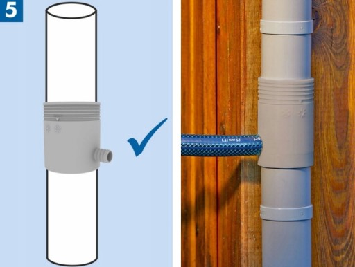 3a. Starannie przyciąć (np. nożykiem) górną część zbieracza na wodę deszczową do wymiarów średnicy zewnętrznej rury spustowej i nasunąć ją na górną rurę spustową.