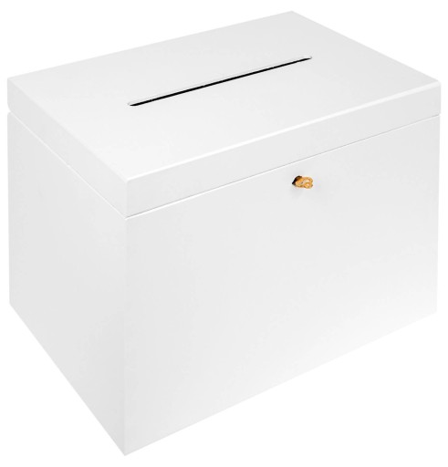 Jak wszyscy wiemy, najczęstszym prezentem dla Pary Młodej są koperty z pieniędzmi, kartkami czy losami lotto. Drewniane pudełko na koperty będzie wspaniałym organizacyjnym rozwiązaniem do zebrania ich w jednym miejscu, gwarantującym tym samym, że żadna z nich się nie zgubi. Dodatkowo pudełko z drewna wyposażone jest w kluczyk, co zapewni zawartości większe bezpieczeństwo. Jest nie tylko bardzo funkcjonalna, ale również prezentuje się bardzo oryginalnie i elegancko, zwłaszcza pomalowana na biało, więc nie wymaga dalszej obróbki.