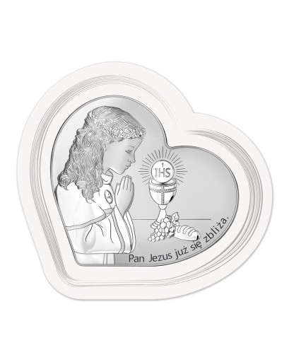 Obrazek srebrny w kształcie serca na białym podkładzie ze srebrnymi zdobieniami z podpisem: "Pan Jezus już się zbliża" przedstawiający dziewczynkę przyjmującą Hostię.