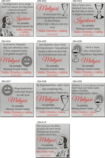 ✔ Przygotowaliśmy kilka gotowych propozycji tabliczek (dostępnych poniżej). We wzorach można zmienić elementy zaznaczone na czerwono. Wybrany wzór zostanie dopasowany do wersji męskiej lub żeńskiej.
