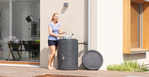 Okrągły zbiornik pozwala zebrać do 250 litrów deszczówki przydatnej do podlewania ogrodu. Jest wykonany z trwałego tworzywa sztucznego, które bez problemu znosi działanie trudnych warunków atmosferycznych. Wodę deszczową można łatwo przelać do naczyń, posługując się praktycznym kranikiem koloru mosiądzu