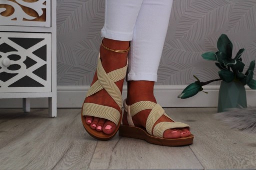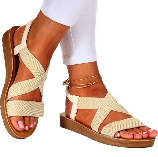 Damskie sandały w kolorze beżowym z paskami na płaskiej podeszwie. Prosty fason sprawia, że idealnie sprawdzą się jako obuwie codzienne w letnie upały oraz z łatwością dopasują się do bardziej oficjalnych stylizacji. Posiadają rozciągliwy pasek z gumy na pięcie do łatwego nakładania oraz dopasowania do różnych tęgości stopy.