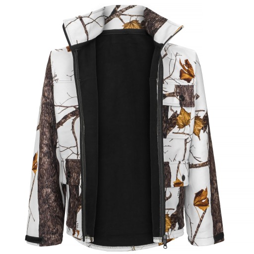 Miękki komplet softshellowy w prawdziwym myśliwskim kamuflażu leśnym białym.